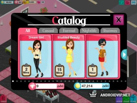Конечно же, самое главное внимание займет создание вещей и аксессуаров. Положитесь на свой вкус, и создавайте неповторимые коллекции на различные тематики. Когда ваша коллекция готова, обязательно развешайте вещи на манекенах, чтобы привлечь внимание покупателей. Когда уровень продаж начнет повышаться, станут доступны и другие возможности. Например, выкройки для новой одежды и аксессуаров, а также шанс сменить имидж главной героини. Причем этому аспекту можно посвятить довольно много времени, ведь игрокам необходимо изменить все, начиная с цвета глаза девушки и заканчивая новыми туфлями.