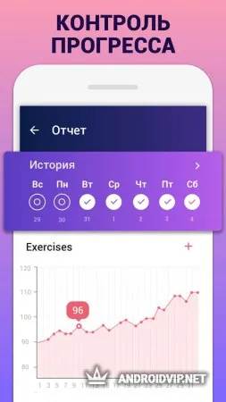 Программа тренировок рассчитана на месяц, каждый день вас будут ждать новые тренировки, интенсивность которых начнёт постепенно возрастать. Для того, чтобы правильно выполнять упражнения, вы всегда сможете воспользоваться советами тренера или посмотреть видеоуроки. Приложением удобно пользоваться благодаря простому управлению и красочному оформлению. Выполняйте упражнения, подсчитывайте калории и следите за прогрессом.