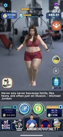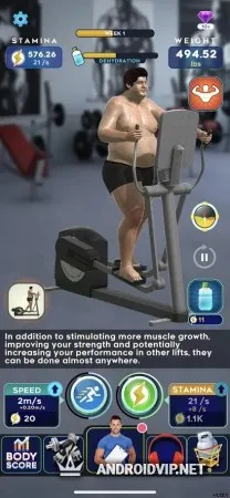 В этой игре для вас подготовлен целый комплекс полезных упражнений, направленных на эффективное сжигание жира. Например, различные кардио-тренировки на беговой дорожке, орбитреке, а также базовые силовые тренировки: жим лёжа, тяга и приседания. Эти и многие другие упражнения подготовлены для достижения поставленной цели. Если вы будете усердно кликать, то через некоторое время ваш герой потеряет лишний жир и станет подтянутым, спортсменом с внушительной, сухой мышечной массой.