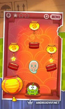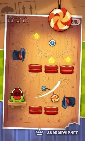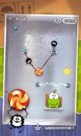 Чтобы скормить леденцы монстрику, который сидит в одной из коробок, необходимо разрезать веревки, на которых подвязана конфетка. Во время этого процесса необходимо успеть собрать три звездочки. Нужно правильно определить, в каком месте разрезать веревки, чтобы леденец не попал в расставленные по всему периметру игрового поля ловушки.