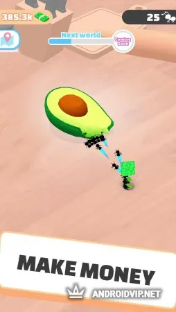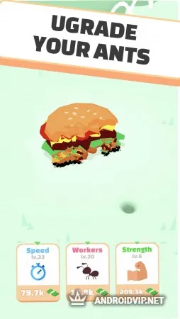 Ваша армия готова подъедать любые предметы, которые возникнут на её пути – деньги, овощи, фрукты, сладости, гамбургеры и много другого. Складывая добычу к себе в норку, муравьи буду приносить вам деньги, которые можно использовать для получения различных улучшений. Увеличивайте количество работников, их скорость и силу. Чем выше эти показатели, тем больше вы сможете заработать. Игра порадует пользователей затягивающим геймплеем, простым управлением и красочным дизайном. Открывайте новые предметы и локации, и заработайте целое состояние!