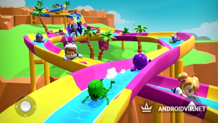 Перед тем как начать, выберите себе персонажа из нескольких десятков вариантов, затем, сразу же отправляйтесь на соревнования вместе с остальными 32мя игроками. Игра состоит из нескольких эпизодов, на каждом уровне необходимо за выделенное время добежать до финиша. Выбывают те участники, которые не успели дойти до конца, а остальные переходят на следующую ступень уже на другой карте, выбираемые случайным образом. Все трассы имеют свои особенности, где-то поверхность заледеневшая и скользкая, где-то обычная, но с секретными ловушками, каждый раз понадобиться приспосабливаться и быть готовым к неожиданностям.