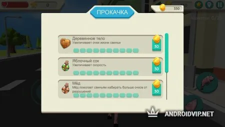 Получайте ценные монеты выполняя задания или собирайте их на улицах города. Заработанные деньги можно потратить на покупку улучшений и апгрейд внешнего вида. Деревянная броня увеличивает очки здоровья, яблочный сок увеличивает скорость, а мёд помогает зарабатывать ещё больше очков уничтожая предметы. Помимо этого, вы можете использовать реактивные ранцы, чтобы быстрее перемещаться в пространстве. Наслаждайтесь захватывающим путешествием с огромным количеством миссий, качественной low-poly графикой и удобным интерфейсом.