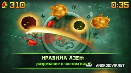 Fruit Ninja – одна из лучших мобильных аркад для Андроид, которую в первую очередь оценят поклонники восточной культуры. Игрок окажется в роли беспощадного убийцы фруктов и ягод – ниндзя-воина. Уничтожение фруктов будет проходить при помощи меча, который можно апгрейдить. Количество заработанных балов зависит от числа уничтоженных киви, бананов, апельсинов, клубники и других целей. Чем больше фруктов будет разрублено за один удар, тем больше будет начислено баллов. Управление ударами происходит при помощи пальцев рук.