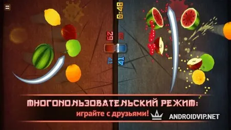 Fruit Ninja получила казуально-симпатичное оформление, изумительную графику. Звуки природы удачно дополняют общую атмосферу. К достоинствам игры можно отнести поддержку функции "multitouch", разнообразие режимов, большой ассортимент мечей, обилие сочных фруктов и ягод. Доступна бесплатная и платная версия игры. Чтобы скачать полную версию Фруктовый Ниндзя нужно заплатить всего лишь 35 руб. Fruit Ninja – отличный тайм-киллер для веселого времяпровождения перед экраном своего девайса.