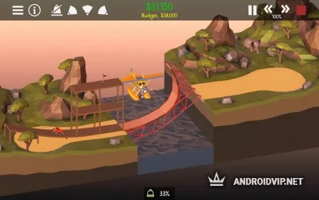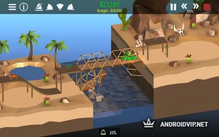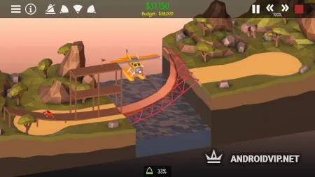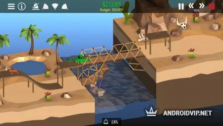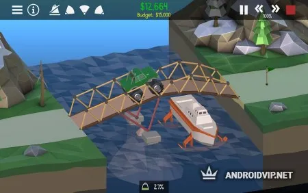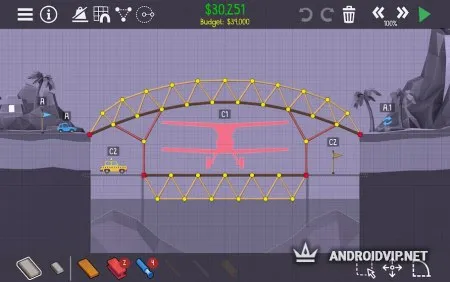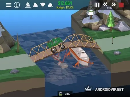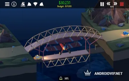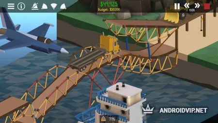 Для начала постройте самый простой мост, по которому проедет всего лишь она машина, для этого не нужна высокая прочность. Постепенно, сложность будет увеличиваться, понадобиться создать такую конструкцию, чтобы по ней смог проехать многотонный грузовик, несколько автомобилей и ещё оставить пространство для проплывающего корабля. Стоит всегда учитывать, что все модули для постройки имеют определённую цену, а ваш бюджет ограничен, от этого необходимо с умом подходить к выбору каждой детали.