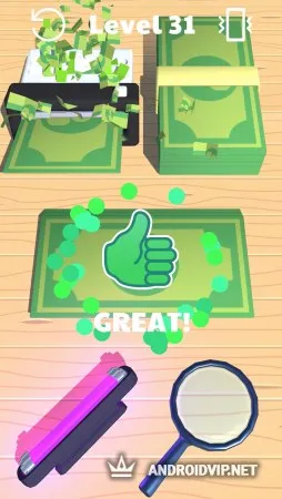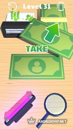 Для начала, можете заняться проверкой купюр на их целостность, если найдёте какое-либо повреждение или пятно, смело отправляйте их в измельчитель. Затем, расфасуйте банкноты, соберите в стопки и положите в чемодан, после чего просто сожгите целую кучу денег, метко бросив в них спичкой. Здесь также присутствуют такие безумные развлечения, как драки с использованием чемоданов с деньгами, или даже есть своего рода раннер, где нужно собирать в тележку деньги и постараться не попасть в измельчитель.