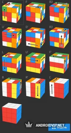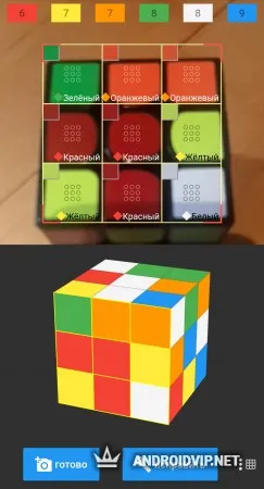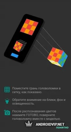 В тот момент, когда возникла трудная ситуация с решением задачи, необходимо запустить данное приложение, включить камеру и поместить в указанные рамки любую грань головоломки. Программа автоматически распознаёт находящиеся цвета в каждой секции, после чего нужно выполнить данную операцию с каждой стороной. Затем, рассчитывается самый быстрый способ сборки фигуры, с подробной инструкцией выполнения каждого шага и анимациями всех движений.