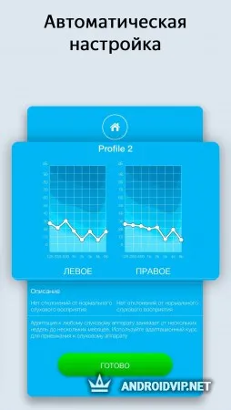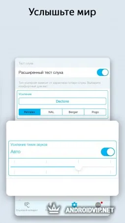 Приложение автоматически настроится под ваши особенности слуха, и установит определённый уровень громкости для каждого уха по отдельности. Присутствует функция адаптации под особенности окружающей среды, будь то шумный общественный транспорт, умеренная рабочая обстановка или тихий домашний уют. Звук усиливается до 30 дБ, при использовании штатных наушников. Благодаря умной динамической компрессии, программа усилит все тихие звуки при этом сохранив общий уровень громкости.