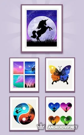 В игре содержится несколько сотен уровней, в каждой из которых вас ожидают уникальные рисунки, разных стилистик. Зарабатывая очки, покупайте новые рамки для ваших произведений и добавляйте их в свою коллекцию. Главным же преимуществом приложения является то, что оно позволяет вам как следует расслабиться, и отлично подходит в качестве таймкиллера!