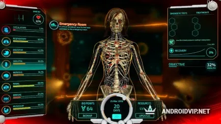 В общей сложности, в игре содержится более 600 реально существующих болезней, вызывающие реалистичные симптомы. В роли врача, проводите различные анализы, с подробно описанными результатами, что помогут более точно узнать о недуге. После выявления проблемы, необходимо назначить лечение или экстренно провести операцию. В образе мучителя, заражайте пленного человека смертельными болезнями, следите за развитием заразы и за последующими симптомами, вплоть до летального исхода.
