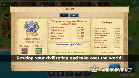 Также, не забывайте про культурное и технологическое развитие, получая специальные очки за успехи в игре, изучайте новые знания, которые откроют дополнительные возможности. Конечно же нужно ещё развивать военную сферу, обучая новых бойцов, чтобы иметь возможность удерживать ваши земли или захватывать новые территории. Помимо войн, часто случаются природные катаклизмы, внутренние раздоры и кризисы, которые предстоит преодолеть на пути к великому!