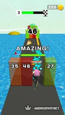 В отличие от остальных игр подобного жанра, здесь предстоит проходить уровни, а не ставить рекорды. В остальном механика игры классическая, персонаж бежит самостоятельно, а вам понадобится менять траекторию одним касанием. По пути собирайте монетки и различную еду, от чего герой будет становиться больше и сильнее, благодаря чему он сможет с легкостью убирать с пути все преграды. Стоит учитывать, что персонаж быстро худеет из-за высокой физической нагрузки, старайтесь регулярно его кормить. Доберитесь до финишной черты с максимально возможным весом, чтобы прыгнуть на водный батут и подбросить вашего напарника как можно дальше.