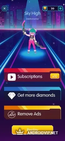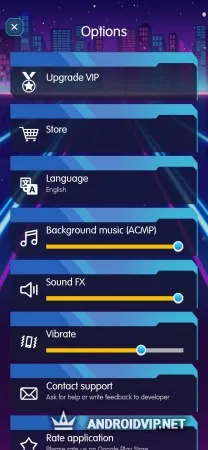Присутствует подробная настоечная панель, где можно регулировать уровень громкости музыки, эффектов, вибрации и многое другое. Графика оформленная в футуристическом и неоновом стиле, с качественными анимациями и эффектами. Коллекция песен и музыки регулярно пополняется новыми произведениями и популярными хитами!