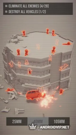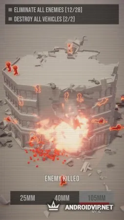 Вас ожидают несколько десятков уровней, с разными условиями прохождениями и сложностями. Изначально, в вашем распоряжении будет только одно оружие, с ограниченным количеством выстрелов. Выцеливайте скопления противников, чтобы одним выстрелом уничтожить несколько противников, находящиеся на крыше, по периметру или внутри здания. Со временем, ваш арсенал пополнится более крупнокалиберными видами орудиями, но и у врагов появятся различные транспортные средства и техника.