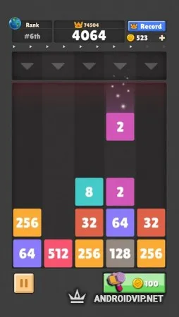 Игра начинается с того, что на изначально пустое игровое поле начинают случайным образом спускаться кубики с самыми разными чётными числами. В основном они начинаются от 2 и заканчивая 128, но со временем могут увеличиться практически до бесконечности. Важно до того, как куб приземлиться, соединить его с другим, имеющим такое же значение, после чего они сложатся и образуется более весомое число. Например, если присоединить два кубика по 32, то в итоге получится один, со значением в 64 очка. Если же поле, где можно выстроить до пяти столбцов полностью наполнится, то игра считается оконченной, после чего высчитывается вся сумма собранных вами очков.