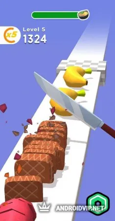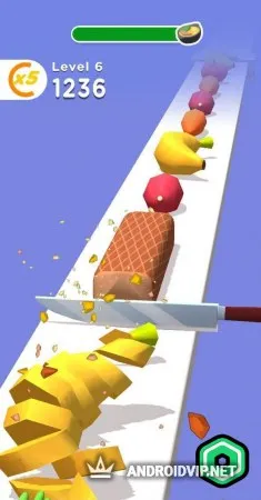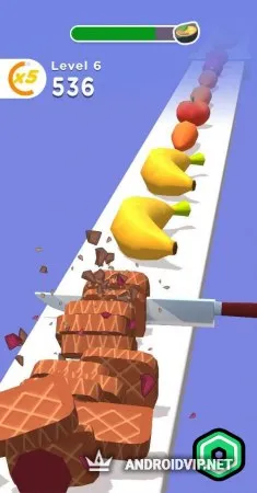 Механика игры довольно легкая, на длинной доске разложены различные фрукты и овощи, которые вам предстоит разрезать на мелкие кусочки. Для этого в вашем распоряжении есть большой и острый нож, что легким движением разрежет любой лежащий на доске продукт. Нажимайте почаще на экран, старайтесь не пропускать ни одного фрукта и создавайте как можно более тонкие кусочки. После каждого пройденного уровня вы получите награду в виде бриллиантов, количество зависит от вашей эффективности во время игры.
