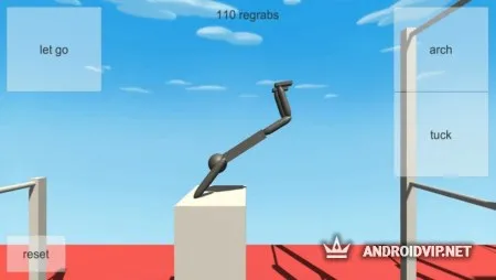 Элементы управления состоят из трёх основных кнопок для сгибания и разгибания ног, а также разжимания хватки, благодаря чему вы сможете выполнять практически все основные гимнастические трюки. В игре графика низкополигональная, что позволяет сконцентрироваться только на самом процессе. Почувствуйте себя настоящим гимнастом, делитесь результатом с друзьями и совершайте захватывающие упражнения!