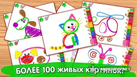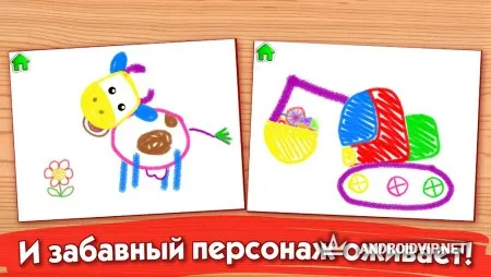 Здесь вас ожидают различные рисунки милых зверушек, машин, насекомых, цветков и многое другое. Все картинки разделены по отдельным категориям, что заметно упрощает процесс поиска. После того как рисунок будет завершён, он оживает и начинает танцевать или бегать по экрану. Например, ежик свернётся в клубочек, а бабочка вспорхнёт и начнёт летать по экрану.