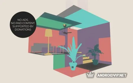 Всего здесь собрано 19 уникальных уровней, которые к тому же полностью созданы вручную. Механика игры достаточно простая, при помощи одного касания вы сможете поворачивать комнату на 360 градусов. В помещении находятся различные бытовые предметы, от которых нужно очистить пространство, это обычные столы, светильники, диваны, домашние растения и так далее. Все они имеют свои уникальные цвета, например, чтобы убрать розовое кресло, поверните комнату так, чтобы он мог раствориться на фоне стены или шкафа такого же цвета.