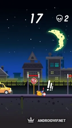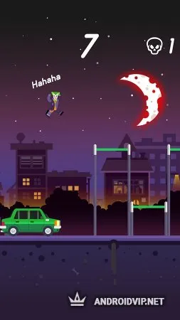 Вы управляете клоуном, который прыгает по трамплинам и крышам машин над испуганными жителями ночного города. Чем дольше вы успешно совершаете эти нехитрые действия, тем больше людей напугаете. Постепенно успешно приземляться на нужные поверхности станет тяжелее, так как они будут иметь свойство уменьшаться. Постарайтесь пройти как можно дальше. Собирайте пузырьки, которые помогут зависнуть в воздухе подольше, а также черепа, с помощью которых можно будет открыть новых клоунов.