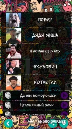 Все мемы в приложении расположены в формате списка в виде вкладок, где у каждого из них есть список тех самых фраз, записанные по отдельным дорожкам. Вы в любой момент сможете воспроизвести их, всего лишь выбрав понравившийся мем и нажав на одну кнопку. Здесь вы встретите такие мемы, как: Ппасный поцык, Повар, Гамаз, Котлеты с пюрешкой, Зелёный слоник, Кама пуля, Стримерша Карина, Язь и многое другое.