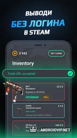 Главной особенностью данной программы является то, что вам не потребуется вводить логин и пароль от аккаунта в Steam, всё переводится на ваш профиль при помощи трейд-ссылки. Также, есть возможность получить ежедневные награды за вход в приложение и приглашённых друзей, отправляя им вашу реферальную ссылку.