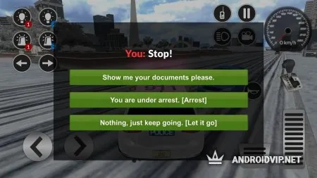 Управление машиной в игре достаточно стандартное, есть две стрелочки для поворотов, педаль газа, тормоза и кнопка переключения передач. В качестве дополнения есть кнопки включения сирены, мигалок, и для остановки нарушителя. После того, как вы задержали кого-нибудь, вам предстоит решить, попросить у него документы, арестовать, или просто отпустить, решать только вам.