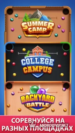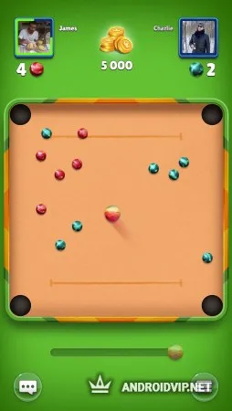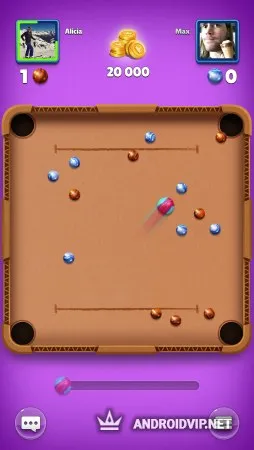 Перед началом игры против настоящих игроков, вы сможете потренироваться с компьютером, чтобы освоить управление и все правила. Затем, сразу же отправляйтесь на дуэли 1 на 1 со случайными пользователями, в разных игровых режимах. В классическом виде игры вам нужно постараться загнать все имеющиеся у вас на столе шары в лунки быстрее вашего оппонента. Также есть режим накопления очков, где побеждает тот, кто смог набрать больше всего баллов до конца игры на общем столе.