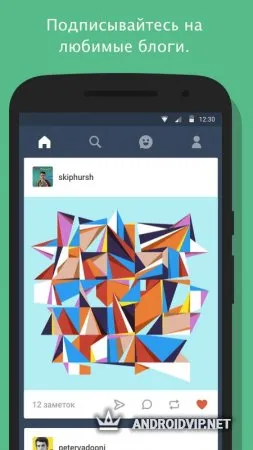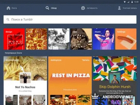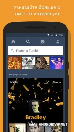 Tumblr - популярная сеть микроблогов, состоящая из изображений, статей и гифок самых разных тематик, где каждый пользователь может завести свой блог с фотками и видео. Недавно вышло и приложение на Андроид, позволяющее всегда быть на связи с Tumblr и использовать его функционал, где бы вы ни находились. Публикуйте посты, пишите комменты, репостите материалы других людей, знакомьтесь, общайтесь. При желании можно оформить свою страничку как вам хочется, изменяя картинку шапки, шрифты и так далее.