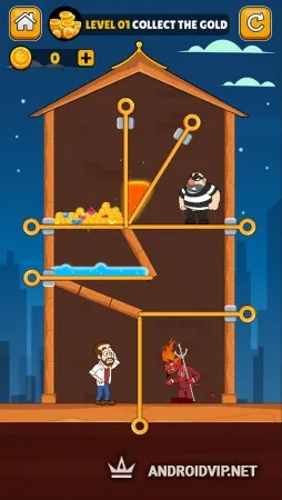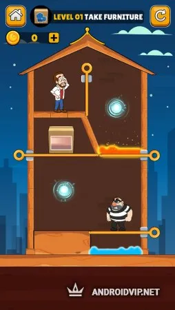 Home Pin - How To Loot? - Pull Pin Puzzle - это казуальная головоломка, с забавным мультяшным внешним оформлением. Здесь вам предстоит помочь главному герою выбраться из довольно нелёгких ситуаций, в которых он оказался. Для этого понадобится хорошенько подумать, и использовать свои логические способности в полной мере, так как от этого зависит судьба его семьи!