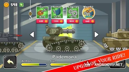 За эти же монеты вы сможете прокачивать ваш танк, увеличивая толщину брони, мощность двигателя и орудия. Также, в магазине можно приобрести самые разные виды боевых машин, отличающиеся своими физическими показателями. Благодаря реалистичной игровой физике, сражения здесь проходят очень даже динамично, несмотря на двухмерную графику!