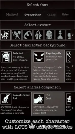 В начале игрового процесса вам предстоит выбрать любой из 4 представленных уровней сложность и одну из 27 различных предысторий для своего героя, каждая из которых будет влиять на сюжетную линию. А так же, настроить несколько десятков уникальных заклинаний и навыков. Все игровые события проходят в интерактивном текстовом формате с мрачными и завораживающими иллюстрациями.