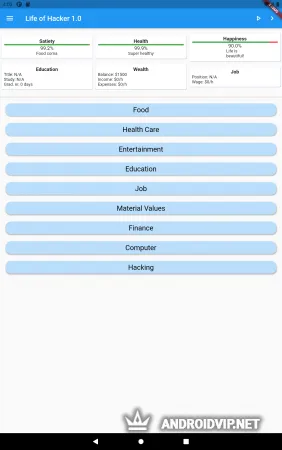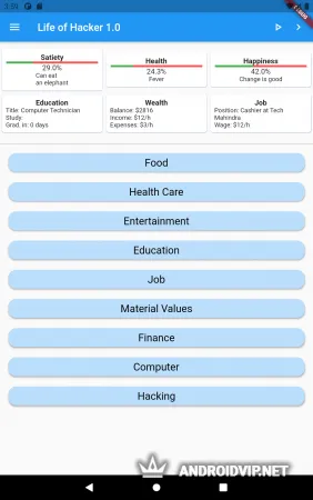 Ваш герой только начинает обучаться компьютерным наукам и главная его цель - взломать сайт самого Пентагона. Для этого ему понадобится ежедневно тренироваться, обучаться методам взлома и постоянно практиковаться. Для начала вам необходимо устроиться на работу, чтобы начать зарабатывать и вкладывать полученные средства в своё развитие. Улучшайте технику, прокачивайте компьютер и покупайте софт, который необходим для взламывания.