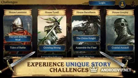Стратегическая игра позволит всем поклонникам легендарных произведений и не менее популярного сериала снова окунуться в атмосферу фэнтези мира и даже принять непосредственное участие в развитии событий семи королевств. Присоединяйтесь к благородным Старкам, влиятельным Ланнистерам, бесстрашным Грейджоям, могущественным Тиреллам, непреклонным Мартеллам и другим великим домам. Возглавьте свой дом и начните собирать войска, которые смогут противостоять армиям ваших соперников.