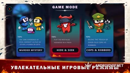 Devil Amongst Us ! Social Deduction Game ! - это замечательная многопользовательская игра, созданная по мотивам культового экшена Among Us. Хотя правила игры здесь не сильно отличаются, есть немало нововведений, которые делают данный проект достойным и уникальным проектом. К тому же, если вам знакома настолка "Мафия", то вы точно оцените и эту игру!