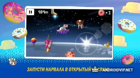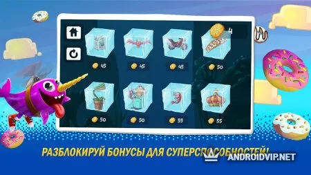 Не стоит пропускать золотые пончики, которые приносят баллы, очки опыта и игровые монетки, которые помогут разблокировать дополнительные возможности и уровни. К примеру, приобретение лопающейся от столкновения кукурузы в несколько раз увеличивает дальность полета кита, а водная маска продолжит время нахождения кита под водой. За виртуальные монетки можно купить различные предметы, которые усиливают возможности – обезьянку, тыкву, скелет, шляпу-сомбреро. После разблокировки доллара нужно собрать всю коллекцию, которая поможет персонажу взлететь далеко ввысь. Чтобы у питомца не заканчивалась энергия, его нужно вовремя подкармливать собранными пончиками и другими вкусняшками. Если все пончики будут съедены, кит не сможет совершать полет. Получить суперэнергию помогут съденные радужные пончики.