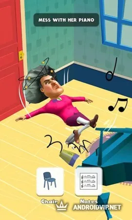 На каждом уровне вам нужно будет выбирать какую шалость совершить из двух предложенных вариантов на всех этапах. Сломайте стульчик, стоящий рядом с пианино, чтобы во время игры она внезапно свалилась, залейте машинное масло под ковёр, разбейте пульт от телевизора и проделайте ещё множество вредоносный пранков. Тщательно продумывайте все свои проделки, чтобы достичь максимально забавного эффекта и стать настоящим мастером розыгрышей.