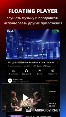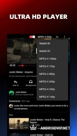 Воспользуйтесь функцией фонового режима, которая поможет вам воспроизводить видео даже при выходе из самого приложения, благодаря чему вы сможете проверять почту, отвечать на сообщения и листать социальные сети параллельно просматривая ролики. Помимо этого, вы можете добавлять понравившиеся видеоролики в закладки и скачивать их на свой смартфон в любом выбранном качестве.