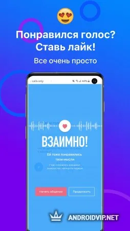 Приложение функционирует по принципу Badoo, Tinder и других социальных сетей и утилит, в которых можно заводить новые знакомства, но здесь вместо анкеты с профилем и фотографий основным инструментом являются голосовые сообщения. Записывайте своё аудио-приветствие и прослушивается голосовые других пользователей, ставьте друг другу лайки и начинайте общение при взаимной симпатии. Находите интересных собеседников, прослушивайте их сообщения, комментируйте, записывайте свои мысли и получайте фидбэк от других пользователей.