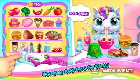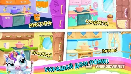 Проявите свои творческие навыки украшая дом единорога, превратив его в настоящий замок или страну сладостей, и обустроив там уютное местечко. Так же вы можете наряжать своего питомца используя одежду и аксессуары на свой вкус, чтобы преобразить внешний вид. Играйте в весёлые мини-игры, развлекайтесь и проводите время с милыми мультяшными героями!