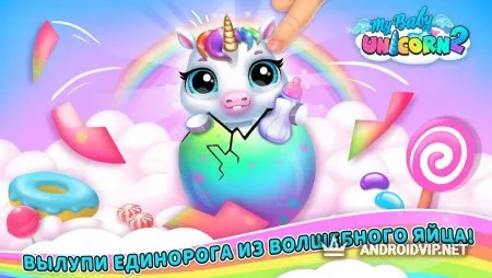 Кто не мечтает подружиться с настоящим домашним единорогом? Теперь у вас есть возможность вылупить из волшебного яйца настоящего малыша-единорога и наблюдать за тем, как он растёт и развивается. В верхней части экрана расположены основные показатели вашего домашнего питомца, за которыми нужно следить и вовремя их заполнять. Заботьтесь о нём, купайте, кормите вкусняшками и укладывайте спать. Приглашайте в гости своих друзей панду и котёнка, устраивайте вечеринки и отмечайте различные праздники.