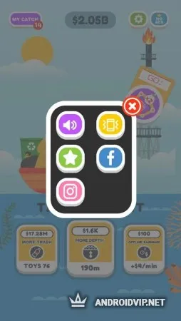 По мере прохождения у вас появится возможность увеличивать вместительность сетки, чтобы можно было вмещать в неё больше мусора, а так же менять максимальную глубину, на которую можно опуститься. Чем больше мусора вы соберёте, тем больше денег заработаете. Старайтесь избегать мины, которые попадаются среди мусора, ведь они могут значительно снизить ваш доход. Очищайте океан от пластика даже в режиме оффлайн, что позволит вам зарабатывать и увеличивать игровой прогресс даже когда вы заняты другими делами.
