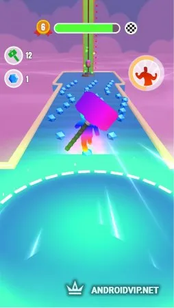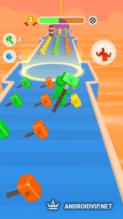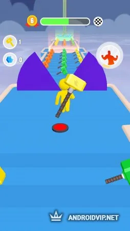 Каждый уровень представлен в виде трассы с препятствиями, где вас ждут новые преграды и ловушки. Нажимайте на экран и управляйте своим героем, чтобы перемещаться по игровому полю. Собирайте разноцветные усилители в виде небольших молотов, которые будут увеличивать силу и размер вашего молота. Избегайте различные ловушки и препятствия в виде острых предметов и используйте свой молот, чтобы рушить стены, стоящие на вашем пути.