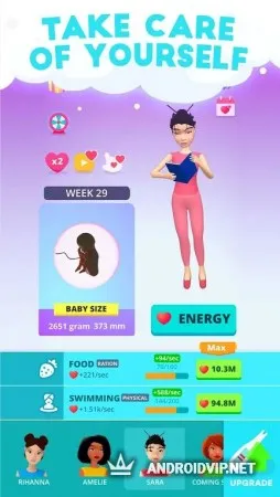 Каждое действие требует затрачивания определённого количества энергии. Нажимайте на кнопку энергии, чтобы начать её вырабатывать в нужном количестве. Правильно распределяйте её между занятиями и следите за тем, чтобы ваша героиня всегда была довольна. Так же вы можете использовать разные усилители, увеличивающие выработку энергии и открыть доступ к функции автоклика. После рождения ребёнка вы сможете ухаживать за виртуальным малышом или же выбрать другого персонажа, чтобы снова пройти вместе весь путь беременности.
