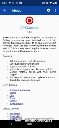 APKGrabber - это простое и довольно нужное приложение, которое поможет вам следить за всеми необходимыми обновлениями установленных на ваше устройство программ и игр. Своевременное обновление версий приложений и поддержание их актуальной версии не только позволит полноценно пользоваться их возможностями, но и значительно повысить безопасность вашего устройства!
