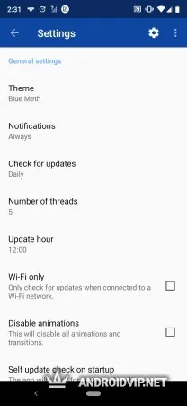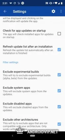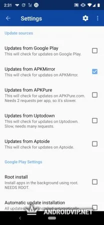 Данная программа автоматически проверяет все ваши приложения и выдаёт подробный отсчёт о наличии обновлений. Затем, вы самостоятельно сможете выбрать источник получения обновления, из доступных на вашем устройстве вариантов, что позволяет подобрать наиболее подходящий вам вариант. Также, есть возможность установить частоту проверок наличия новых версий приложений, после чего вы получите уведомление и сможете рассмотреть предложения.