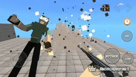 Управление здесь максимально простое, есть стандартный джойстик для передвижения, кнопки для атаки, прыжка, перезарядки и открытия инвентаря. Благодаря большому количеству разрушаемых предметов, эффекты от взрывов и столкновений выглядят довольно эпично, даже несмотря на простую пиксельную графику!