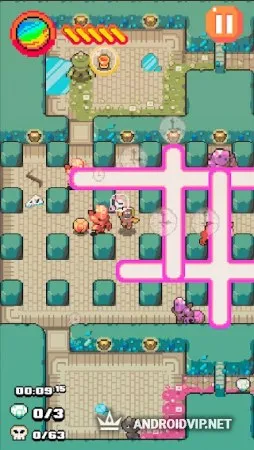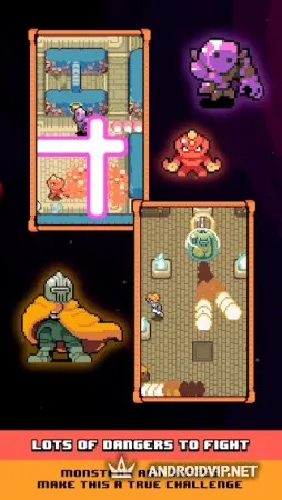 Свайпайте по экрану в нужном направлении и передвигайтесь по игровому полю. В пути вам повстречаются различные монстры, ловушки и преграды. Собирайте различные предметы и оружие, чтобы атаковать монстров или старайтесь избегать с ними встречи. У вас есть ограниченное количество жизней, поэтому будьте осторожней. Игра имеет вид сверху и оформлена в красочном пиксельном стиле, благодаря чему вы сможете ощутить ностальгию и насладиться весёлым геймплеем.