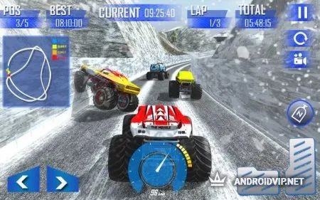 Снег гоночный монстр грузовик / Snow Racing Monster Truck 17 - многие из вас хотели бы прокатиться на джипах с огромными колёсами, которые носят название "big foot". А что если устроить на этих махинах гонки по заснеженным трассам? Данная игрушка предлагает вам ощутить весь драйв от соревнований на этих здоровенных тачках в экстремальных условиях. Выберите свой джип и отправляйтесь на старт. Жмите педаль в пол, чтобы разогнаться до предела, но будьте внимательны на поворотах, чтобы не улететь в сугроб и не дать противнику обогнать себя. Рассчитывайте скорость и маневрируйте на опасных участках трассы. Аккуратное вождение и чувство трассы несомненно приведёт к успеху!